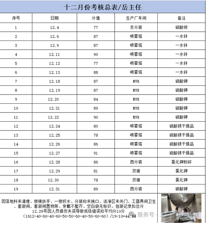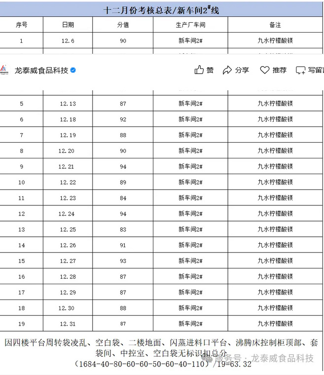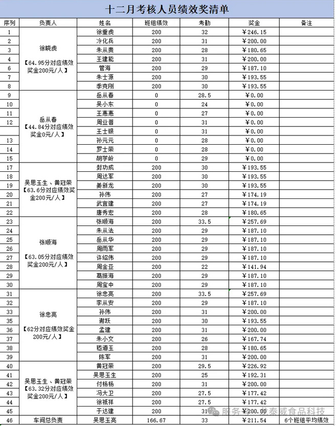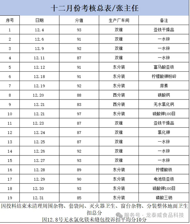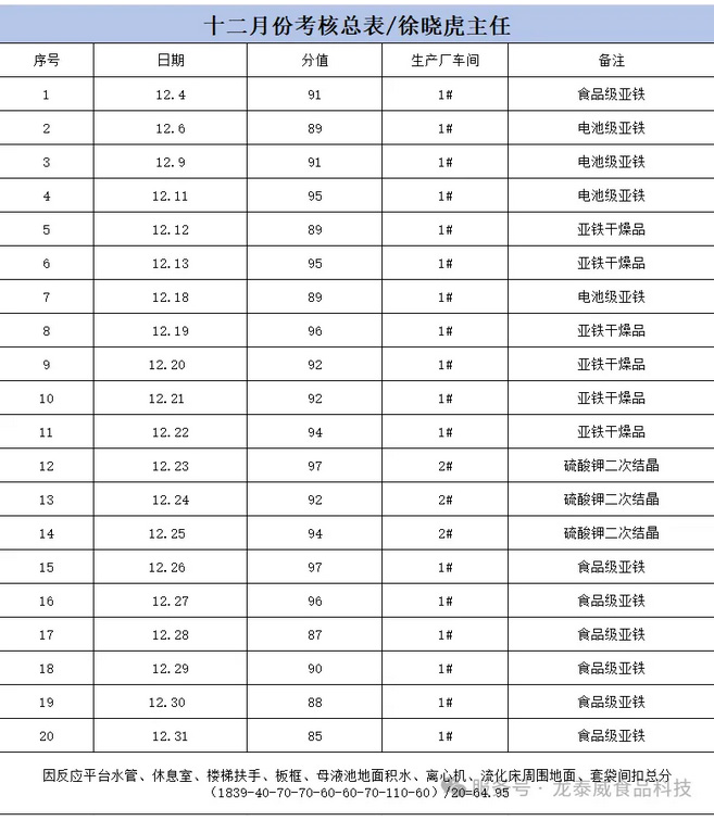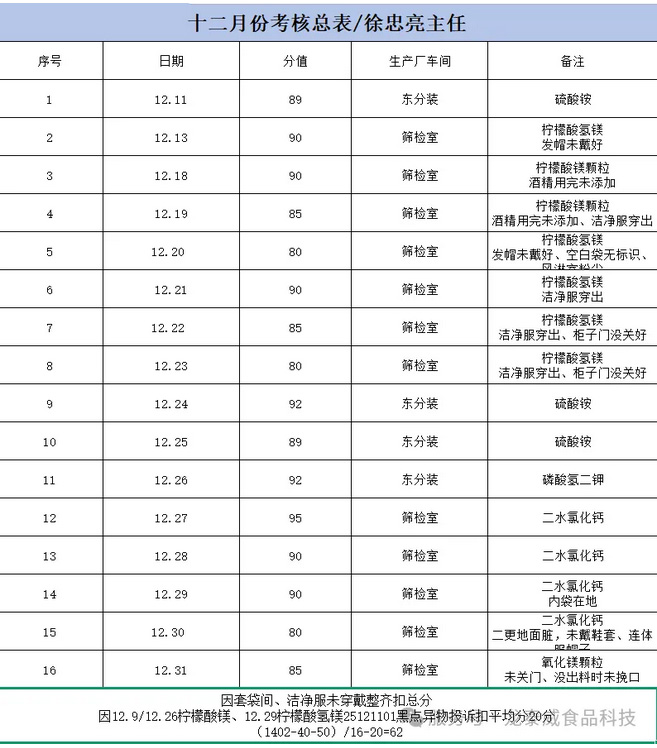 本次考核围绕环境卫生、标识管理、生产记录、原辅料领用四大核心维度,进行了全面、细致的核查评分。现将考核绩效奖金公示如下: